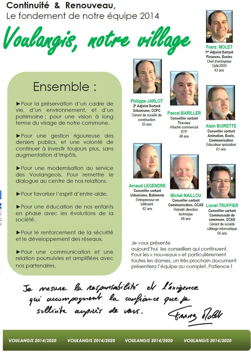 Une équipe qui s’inscrit dans la continuité de l’action municipale de ces dernières années. Les membres sortants de la municipalité actuelle en sont les garants, leur présentation fait l’objet de ce premier document. Les thèmes fédérateurs de l’équipe sont rapellés : – préserver notre cadre de vie – gérer de manière rigoureuse les finances – moderniser le village – favoriser entraide et communication – accompagner nos écoles dans leur modernisation. A suivre, les présentations des nouveaux membres de l’équipe, qui apporteront un oeil neuf et des compétences complémentaires. La page facebook : https://www.facebook.com/Voulangis2014 |