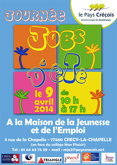 |  | La Maison de la  Jeunesse et de l’Emploi du Pays Créçois organise sa journéeJOBS D’ÉTÉ le mercredi 9avril 2014 de 10h à 17h , dans ses locaux, 3 rue de la Chapelle àCrécy-la-Chapelle (au 1er  étage de la Communauté de Communes,devant le collège Mon Plaisir)