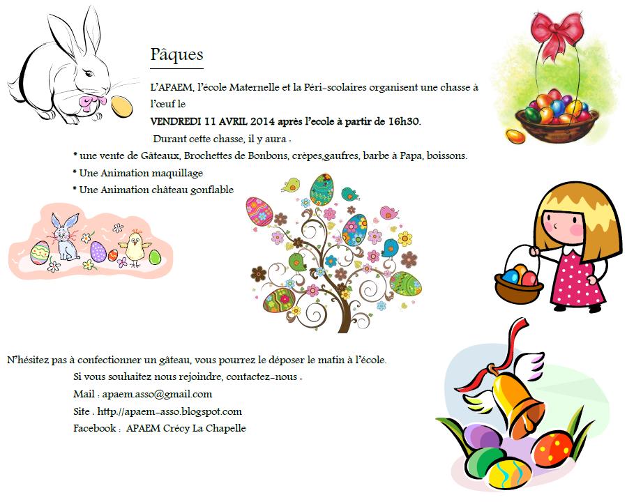 Paques, c’est bien le 20 avril. Par contre les vacances cette année en zone C c’est du 11 avril au soir jusqu’au 28 au matin. D’où ce choix de l’école de Crécy de faire la chasse aux oeufs juste avant de partir en vacances.