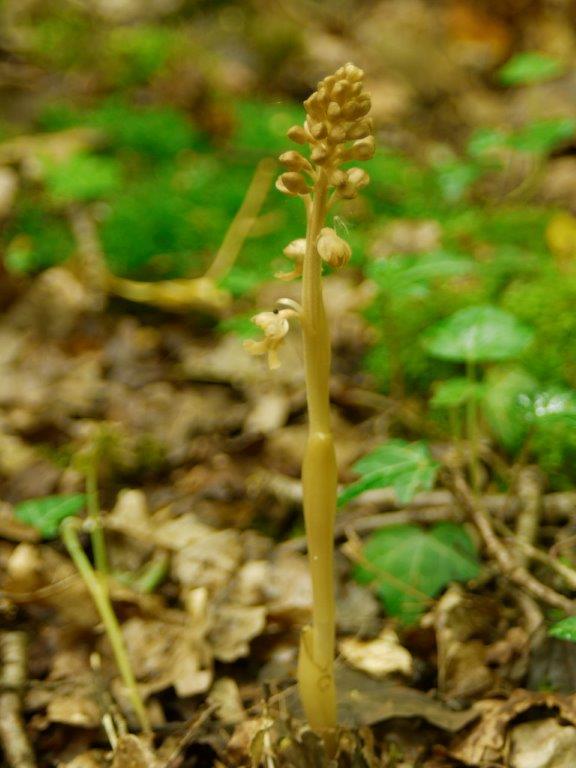 Les individus de cette espèce sont très souvent isolés. D’une couleur de beige à brunâtre évoquant le miel, sonobservation reste difficile dans les bois ombragés de Montaudier, près du lavoir ou elle vit. De plus, elle est susceptible de fleurir et de fructifiersous terre et peut rester 9 ans ainsi avant d’apparaitre pour la premier fois, et la dernière, puisqu’elle dépérit après cette unique floraison. Elle a lafaculté de se cloner à partir de fragments de racines. Son apparition est par conséquent sporadique. La fleur sécrète du nectar pour attirer les mouches etles fourmis. Mais elle peut aussi se féconder par l’autogamie… A ce petit inventaire, n’oublions pas de rajouté lesorchidées déjà présentées sur le site… Platanthère à deux feuilles (Platanthera bifolia – (Linné-1753) L.M.C. Richard 1817)