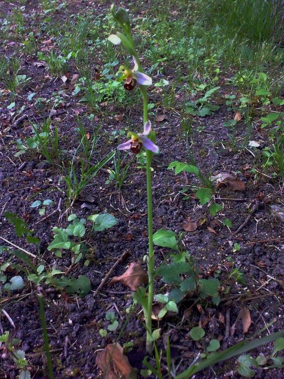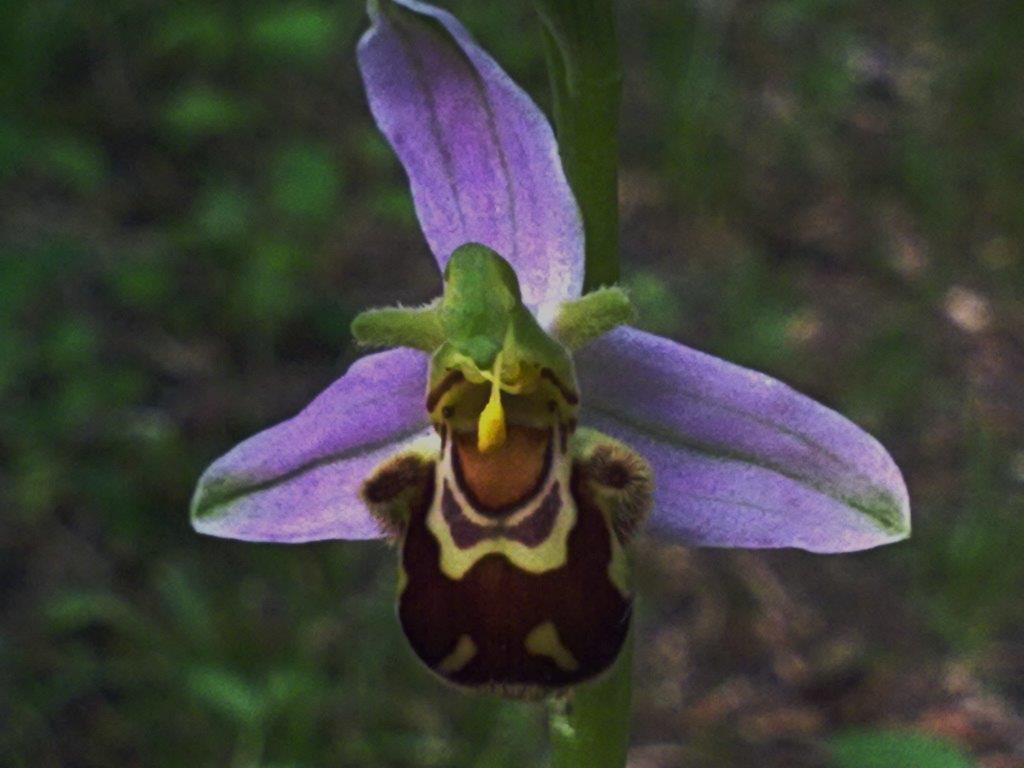 C‘est une espèce qui préfère l’ombre,aux pétales filiformes rappelant les antennes des Hyménoptères (abeilles,guêpes, fourmis), avec des gros pseudo-yeux noirs et luisants. Elle mesureentre 30 et 40 cm et se compose de 3 à 18 fleurs généralement. Celles que j’aipu observer sur nos coteaux, en présentent toujours 2 et par renouvellement…jamais plus ! Une fois que les deux fleurs sont fanées, 2 autresapparaissent… Je ne sais pas pourquoi il n’y en a pas plus. Ophrys abeille (Ophrys apifera – Hudson 1762)