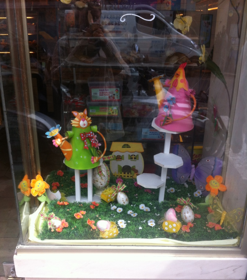 Le thème du moment (en dehors de Noël) n’est pas toujours abordé. Les boulangers/patissiers/chocolatiers abordent toujours le thème pascal, normal 😉 Peu de commerces créçois l’ont fait pour Pâques. Dommage.