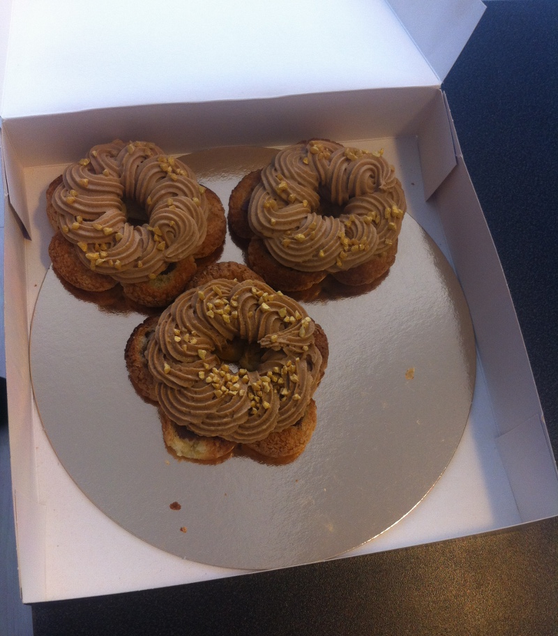 Notre chocolatier, Place Camus, a fait le choix du Paris-Brest. Voici unexemplaire du vrai, l’original (symbole d’une roue de cycle)