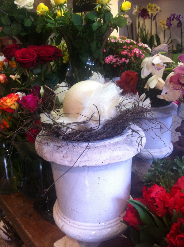 Un œuf d’autruche (un vrai !) chez notre fleuriste de la Place duMarché. Après tout, pourquoi toujours des œufs de poules ?