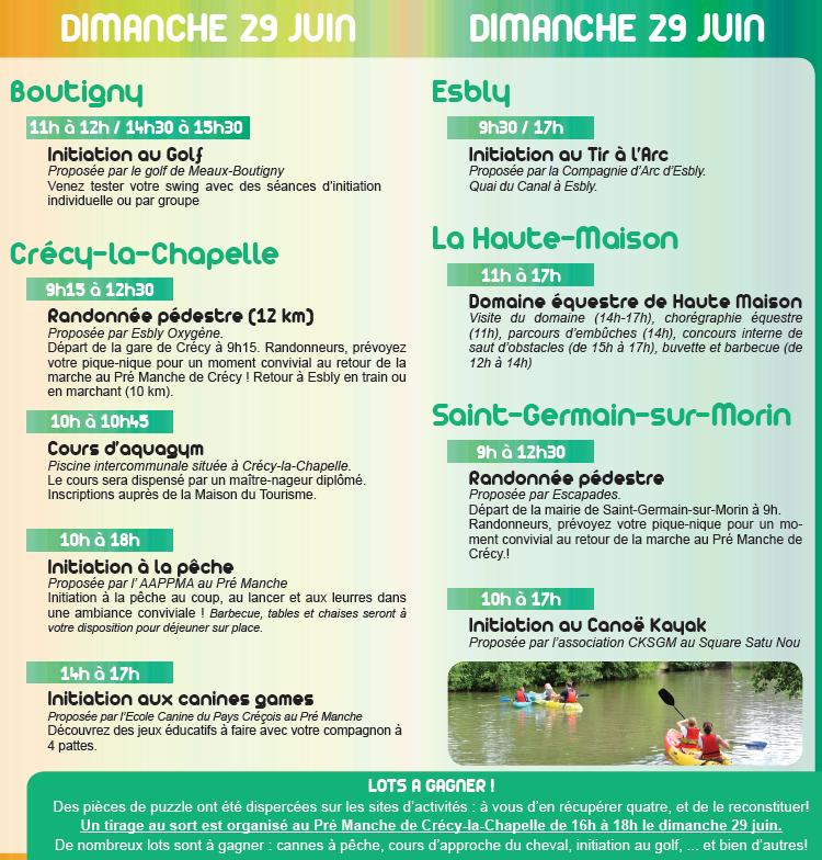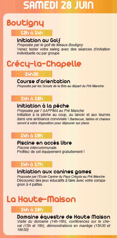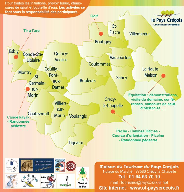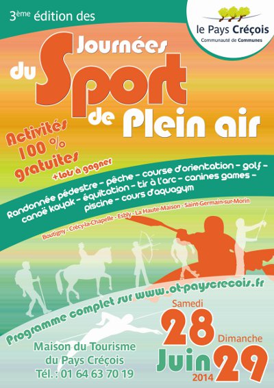 La Communauté de Communes du Pays Créçois organise la 3ème édition des journées du sport de plein air les 28 et 29 juin 2014. Activités 100 % gratuites sur les communes de Boutigny, Crécy-la-Chapelle, Esbly, La Haute-Maison et Saint-Germain-sur-Morin.