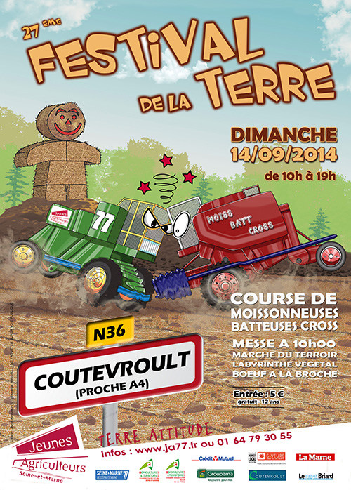 Principale manifestation agricole du département, le Festival de la Terre accueille chaque année plus de 7000 visiteurs. Cette année, il aura lieu le dimanche 14 septembre 2014 à Coutevroult. Le terrain se situera le long de la Nationale 36. Une quinzaine de jeunes agriculteurs du secteur travaillent depuis décembre 2013 à la réussite de la fête destinée à faire découvrir l’agriculture au grand public de façon ludique. Fort de leurs 27 ans d’expérience, les Jeunes Agriculteurs vous garantissent du spectacle et du divertissement à travers des animations avant tout familiales : moiss’batt cross, loto-bouse, marché de terroir, baptême de tracteur, bœuf à la broche à déguster sur place, baptême en hélicoptère, mini-ferme, jeux-concours…sans oublier la messe qui sera cette année célébrée par l’évêque de Meaux à 10h00. Tarif : 5€ – gratuit pour les moins de 12 ans Infos : 01 64 79 30 55 ou www.ja77.fr |