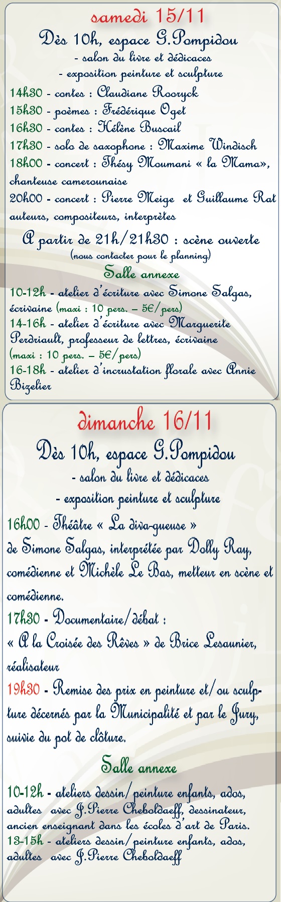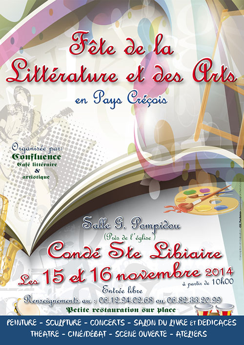Le café littéraire Confluence organise le week-end prochain un événement culturel sans précédent en pays créçois.Pendant 2 jours se succéderont concerts, expositions, salons, pièces de théâtre, ateliers d’écritures, …Cela se passe à Condé salle Georges Pompidou, samedi 15 de 10h à 21h30 et dimanche 16 novembre de 10h à 19h30.Voir le programme complet dans la suite de l’article. |