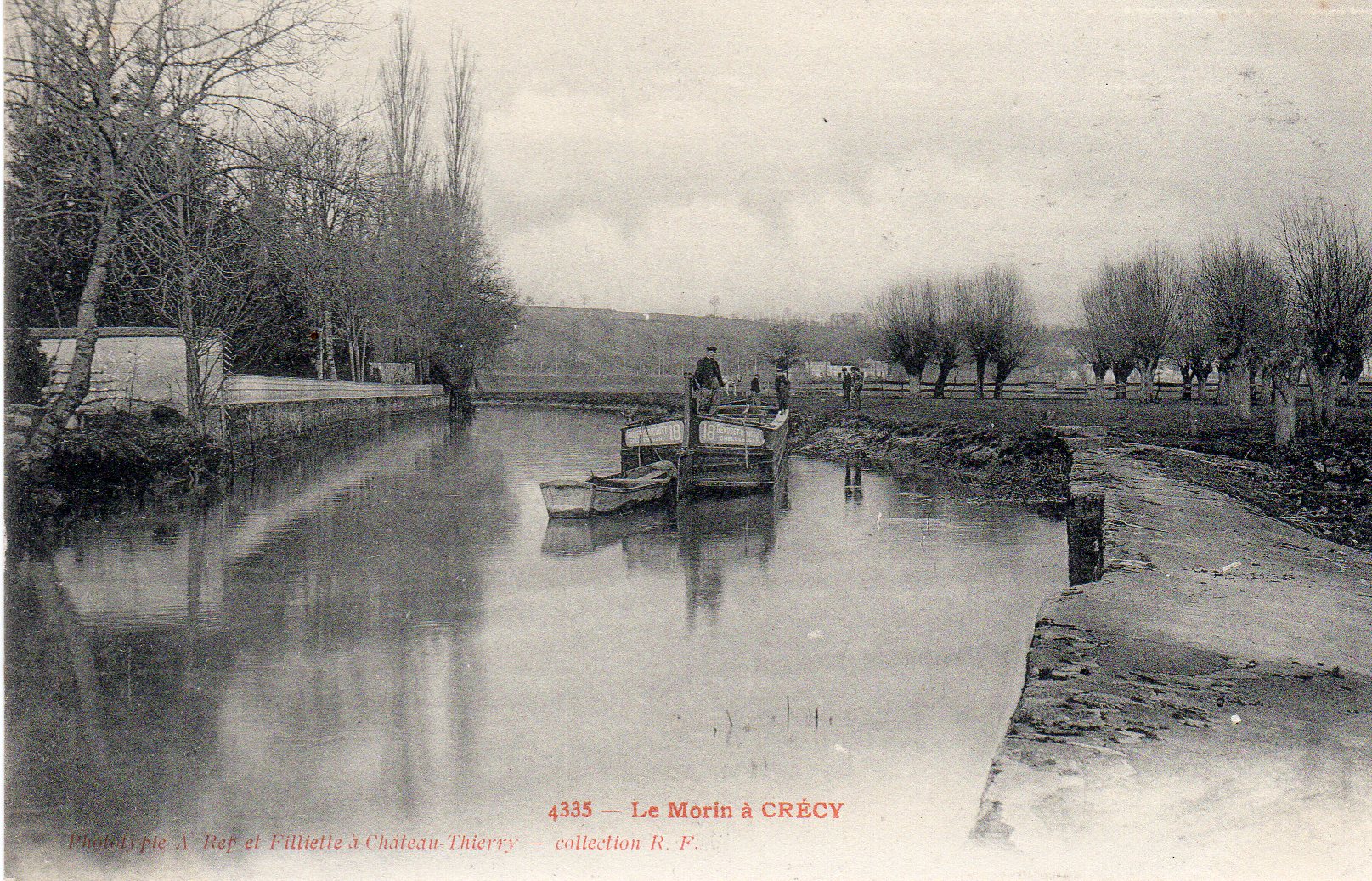 Cpa datée de janvier 1906 Editeur JD Photo – Couilly, la péniche chargée de bois de chauffage porte la marque Roeser Le bois a toujours constitué la marchandise la plus transportée sur la rivière. En 1889 de grandes coupes de bois furent pratiquées en forêt de Crécy. De gros volumes de grumes furent débardés jusqu’à Crécy, stockés dans les prairies longeant le Morin, créant ainsi un "port à bois" éphémère. L’évacuation des coupes se fit sur de longs mois et déjà les meuniers avaient mal vêcu cette surexploitation du trafic sur la rivière (Source A. Bazin).