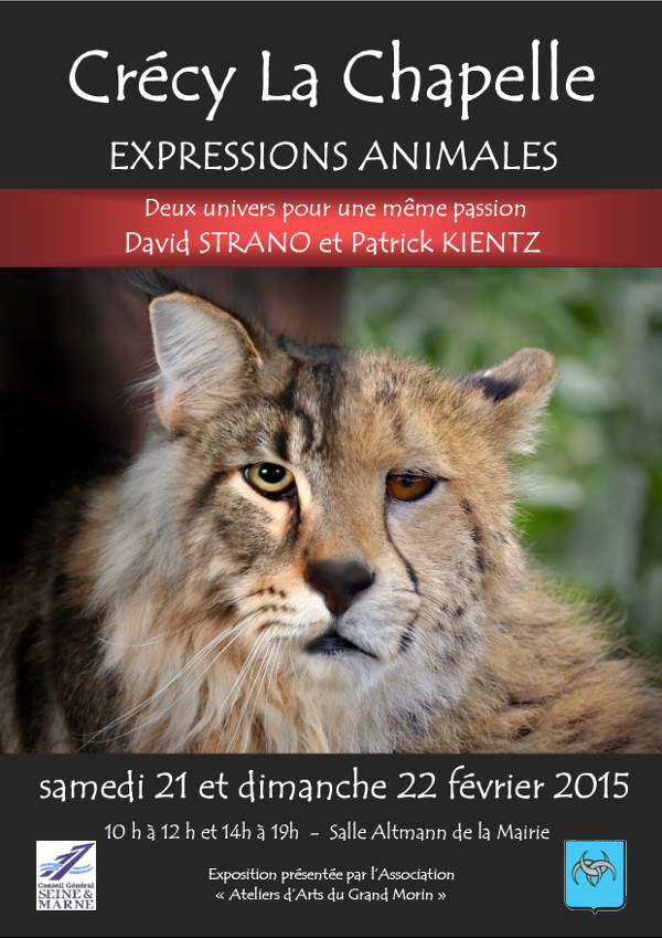 Soutenus par la Mairie et le Conseil Général 77les « Ateliers d’Arts du Grand Morin »vous proposent l’exposition photographique « EXPRESSIONS ANIMALES » des deux photographes animaliers talentueux et de registres différents Patrick KIENTZ et David STRANO. Salle ALTMANN de la Mairie de CRECY-LA-CHAPELLE les 21 et 22 février 2015 Entrée gratuite de 10 à 12h et 14 à 18h. |