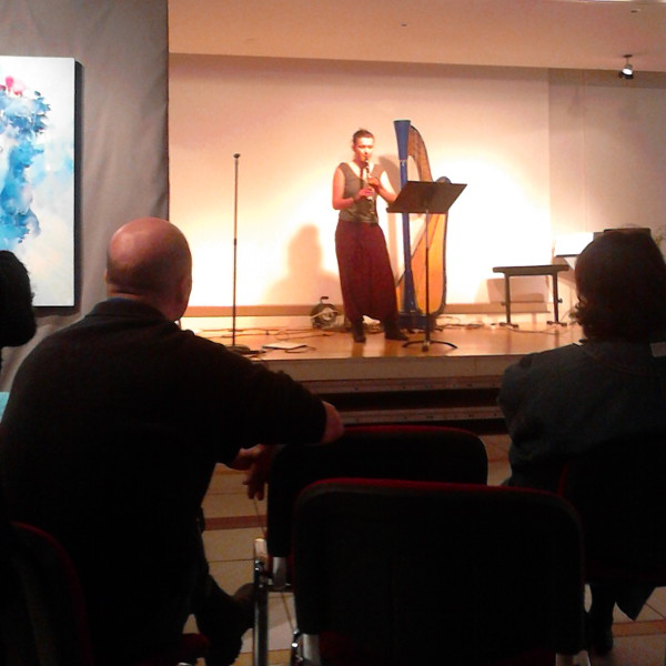 Avant de partir, Martine me dit : « viens demain, à 15h00, une de mes amies musicienne vient jouer de la harpe, tu verras, c’est sympa. » Ok Martine, à demain. J’aime beaucoup la harpe ! Génial ! Je viens au rendez-vous, à 15h00. Quelques chaises sont disposées face à l’estrade où s’élève, magistrale, une harpe électrique bleue. Je m’assois sagement et quelle ne fut ma surprise d’entendre cet instrument plutôt classique ‘‘groover’’, ‘‘swinguer’’, telle une guitare ou une basse ! Ah mince alors, je m’attendais à une démonstration de musique classique ! Génial, j’aime beaucoup ! Bravo Madame (de son nom de scène « Sève »). Ah mais ce n’est pas tout, une voix chaude et très masculine l’accompagne avec des chansons à textes et là, j’en reviens pas, j’écoute, j’observe, je regarde les doigts de l’artiste sur son instrument, majestueux, tantôt dans la lenteur, tantôt dans la vitesse mais toujours dans la finesse, les notes roulent, bondissent, se font tantôt mystérieuses, tantôt rigolotes, l’artiste maîtrise, je suis admirative. Le comble fut lorsqu’elle se mit à jouer à l’envers, assise à même le sol, la harpe à l’horizontal et de ce fait les cordes inversées ! Du grand art Madame… Quant à vous Monsieur (« Monsieur Poli) qui avez chanté vos si belles chansons, vous m’avez fait pleurer en chantant « Novembre » dont le sujet est votre vie avant et après la naissance de votre fille née en novembre. Ah me voilà chamboulée, l’émotion à fleur de peau, « va savoir », « Pom-pom-pidou Pompidou », « l’Etranger de l’intérieur » (magnifique), Tékonoukoi, . Vous avez été jusqu’à nous chanter « l’hymne à l’amour » toujours accompagné par cette harpe magnifique. Vos filles ont également participé à ce ravissement en jouant de la clarinette. Bravo à elles également. Vous vous êtes prêtés au jeu de la pause-photo pour moi et je vous en remercie. Monsieur Poli et Sève Les enfants de Monsieur Poli et Sève sont également des artistes prometteurs Pour la peine d’être si talentueux, vous ne me donnez pas le choix, je communique sur les Brionautes l’adresse de votre Site Internet : www.monsieurpolietseve.com Je suis sortie de la salle Altmann ayant l’impression d’être partie ailleurs, loin de Crécy, enchantée. Bravo à tous, Martine de Felice (Peintre et Sculpteuse), Sonia Daubry (Designer Graphique), Sylvie Gaudin (Créatrice de l’Atelier « les curieuses »), Frédérique Tilly (Créatrice de bijoux et d’objet de décoration). Bravo à Monsieur Poli, Chanteur-auteur de chanson à textes et Sève, musicienne et maestria de la Harpe. Pour ces moments de plaisir, merci, merci, merci à toutes et tous. |