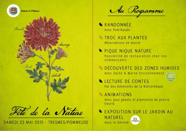Cette année c’est du 20 au 24 mai 2015. Allez sur le site de la Fête de la Nature et Choisissez ! Mais vous n’oublierez pas la fête de la Nature à Pommeuse, au Petit Stade de Tresmes : http://pommeuse.org/2015/05/06/fete-de-la-nature-2015/ |