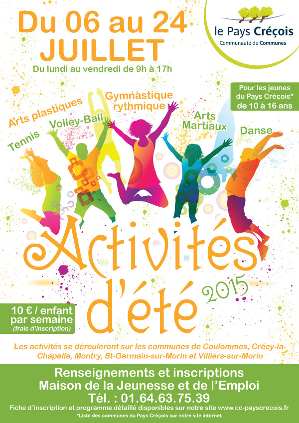 Les activités se dérouleront sur les communes de Coulommes, Crécy-la-Chapelle, Montry, St-Germain-sur-Morin et Villiers-sur-Morin. Cette année des associations du Pays Créçois proposeront d’initier les jeunes au tennis, Volley-ball, Arts plastiques, Arts Martiaux, Danse et Gymnastique rythmique. L’activité choisie doit être suivie sur une semaine entière au minimum.