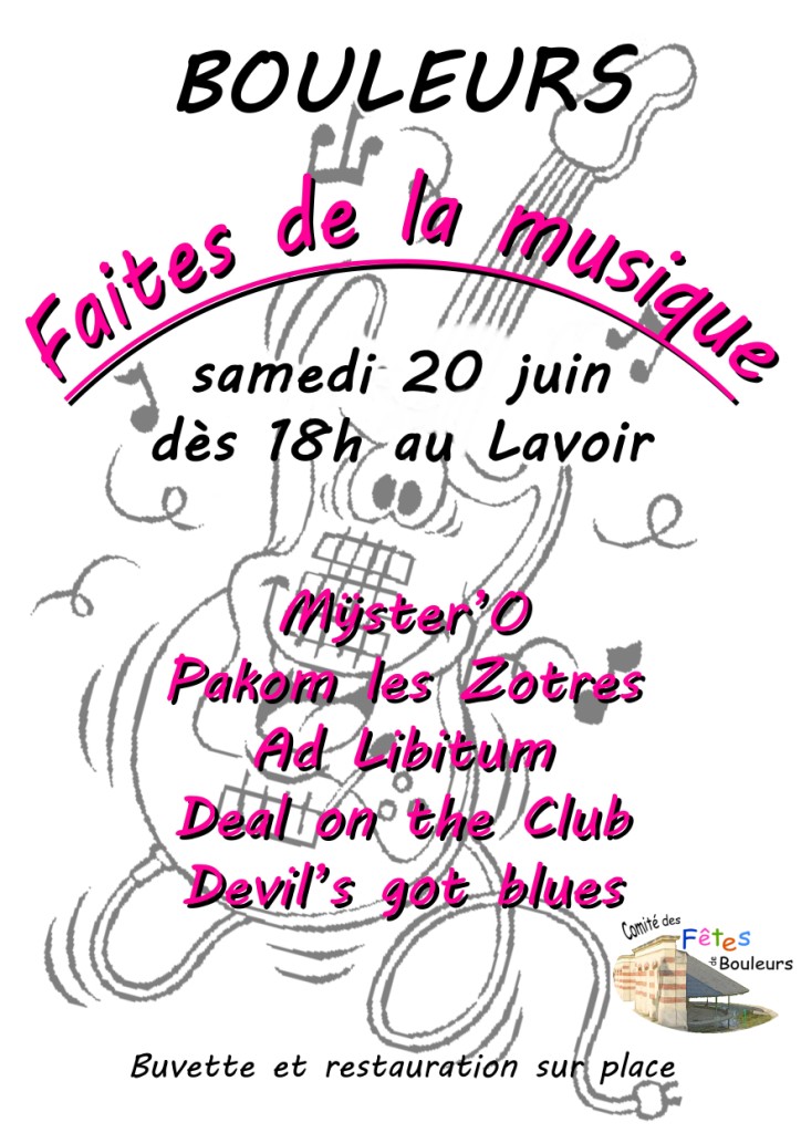 Faites de la Musique à Bouleurs par pascale Zabalia · 14 juin 2015 « FAITES DE LA MUSIQUE », le samedi 20 juin 2015 au lavoir de BOULEURS, à partir de 18h, avec le comité des fêtes. Au programme, cinq groupes, MISTER’O, PAKOM LES ZOTRES, AD LIBITUM, DEAL ON THE CLUB, DEVIL’S GOT BLUES (article vu 7 fois) Partager