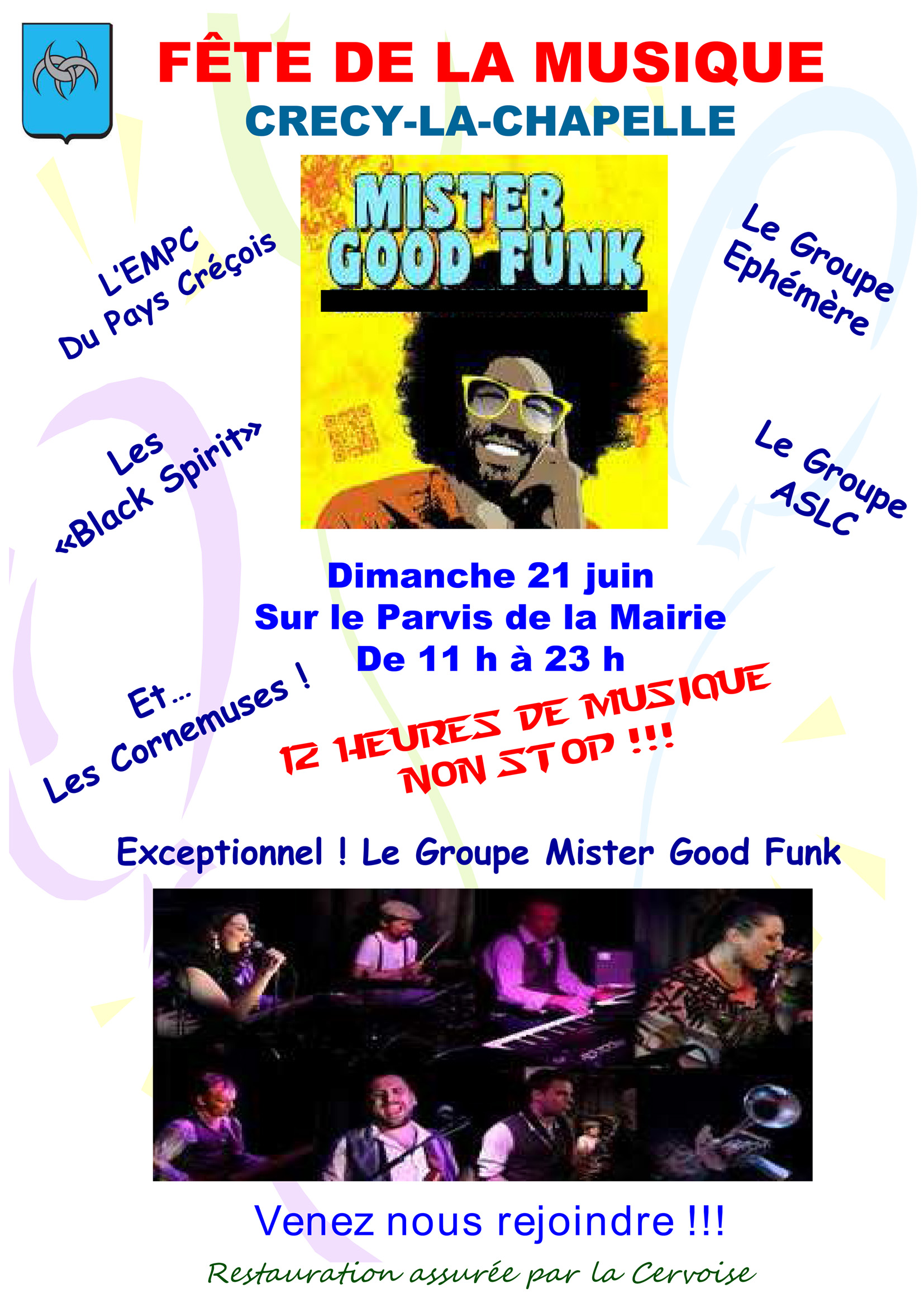 Crécy-la-Chapelle retrouve sa Fête de la Musique ! Avec la participation exceptionnelle du groupe Mister Good Funk 11h à 23h, 12h de musique non stop ! Une fête de la musique pour tous les goûts ! Et une restauration assurée par la Cervoise. Programme (à titre indicatif) : « Mister Good Funk est un groupe d’animation, composé de 8 musiciens expérimentés, qui tourne depuis 2007 dans toute la région parisienne et dont le répertoire est constitué de reprises de standards soul, disco et funk allant de James Brown à Jamiroquai en passant par Chic ! Ils se produisent dans de nombreux lieux très différents ; pubs, clubs, soirées privées, collectivités, séminaires, congrès, évènementiel… » « Ils n’ont qu’un seul objectif : nous faire danser jusqu’à l’épuisement !! » |