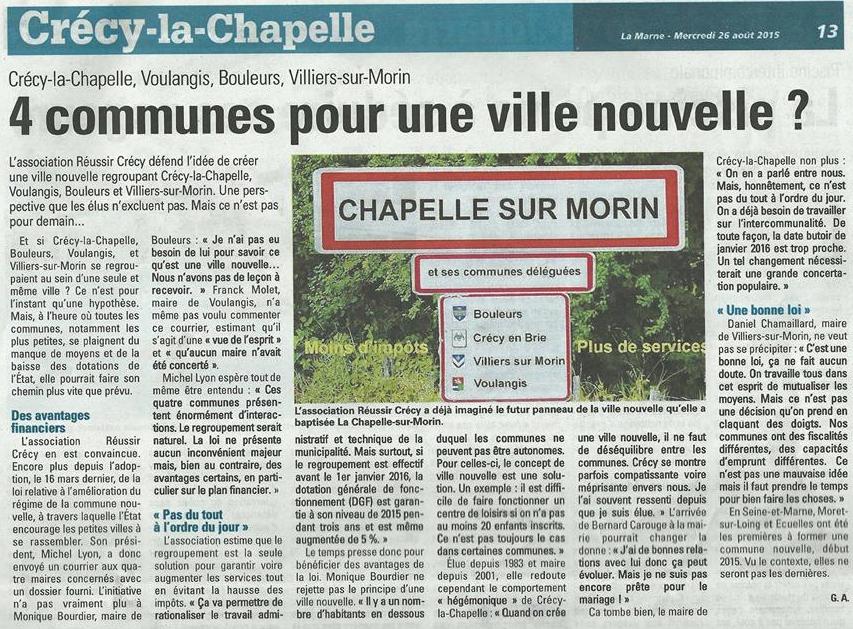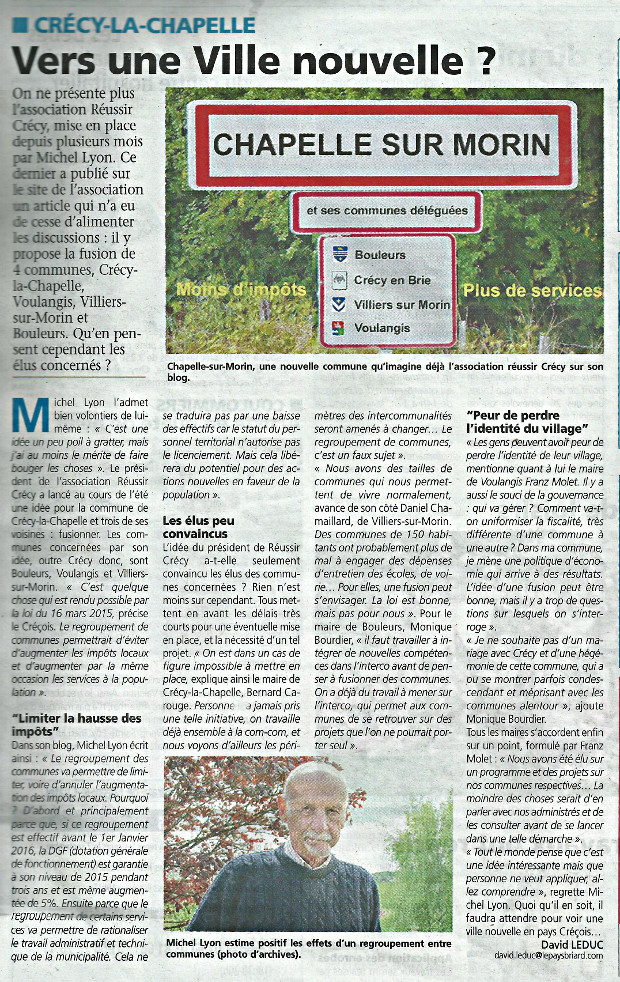 "Réussir Crécy" s’est en effet relancée et restructurée. Vous trouverez sur son site (http://reussir-crecy.fr/) les informations sur cette association. Elle a pour but de réfléchir à l’avenir de la cité et de faire des propositions. Elle commence très fort en imaginant de fusionner Crécy avec les 3 communes voisines Bouleurs, Villiers et Voulangis. S’appuyant sur une loi récente et sur des enjeux d’économies, l’idée a quelque chose de révolutionnaire. |