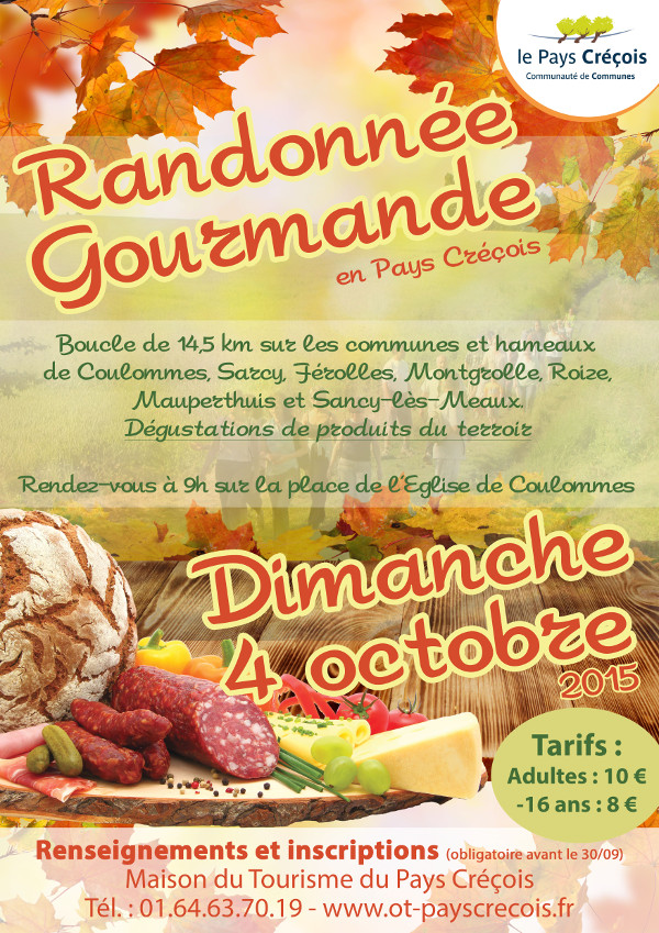 Le dimanche 4 octobre prochain, la Communauté de Communes du Pays Créçois organise sa randonnée gourmande, sur les communes de Coulommes, Bouleurs, Crécy, Sancy-lès-Meaux et leurs hameaux : 14,5 kms de balade dans une ambiance chaleureuse, sur un parcours accessible à tous, ponctué de pauses gourmandes, pour découvrir ou redécouvrir les produits de notre Terroir : cidre, fromage, terrines, … Rendez-vous à 9h sur la place de l’Eglise de Coulommes.  Tarif : Renseignements et réservations (obligatoire) auprès de la Maison du Tourisme au 01.64.63.70.19 – www.ot-payscrecois.fr |