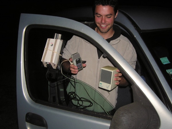 ![]() Le trajet (environ 30 km) est parcouru à 30 km/h environ et les émissions sonores des chiroptères sont captées par le micro. Dès qu’un ultra son est capté il est enregistré durant 0,3 s, puis divisé par 10 en fréquence durant 3 s, ce qui permet de les entendre dans le petit haut-parleur que tient Damien.