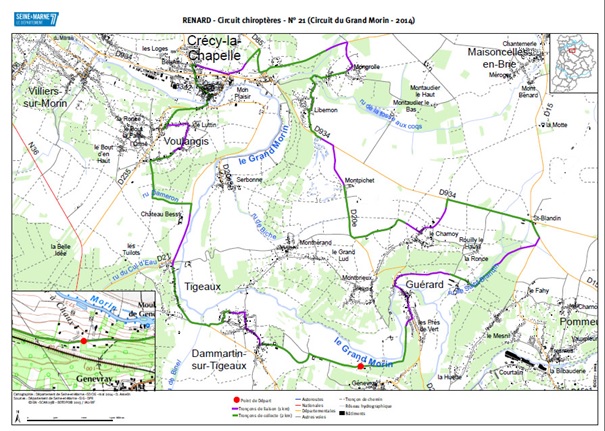 Le Tranquilty transect (le boitier gris fixé sur la vitre de la voiture) et son micro sensible aux ultra-sons, l’enregistreur numérique dans la main droite de Damien et le haut parleur pour entendre en direct (mais fréquence divisée par 10) les chauve-souris croisées sur la route dans sa main droite. Le parcours, de Crécy-la-Chapelle à Guérard, passe sur le plateau agricole et sur les versants de la vallée du Grand-Morin, donc dans des biotopes différents : |