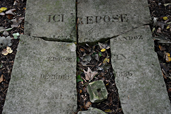 Je suis donc remonté au cimetière. Cette fois je ne me suis pas contenté d’un balai pour enlever les feuilles mortes, j’ai pris une serpillière pour nettoyer la pierre de la tombe n°7 difficile à lire. Cela donne le texte que j’ai essayé de décrypter. Pour avoir le texte complet, il faudrait soulever la partie de pierre supérieure qui est cassée et qui est recouvre en partie le bas de la pierre. Son poids nécessite du matériel approprié.