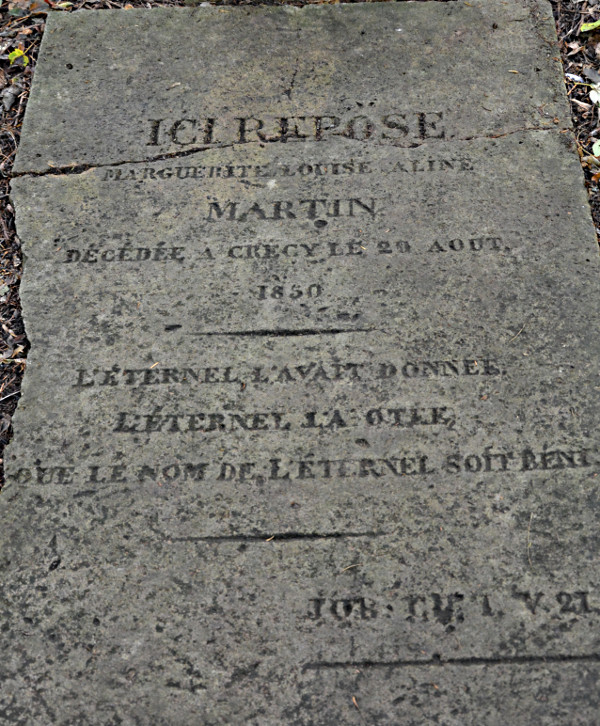 | Mon premier article sur le site – c’était en 2003, cela ne nous rajeunit pas – parlait du cimetière protestant du bois des morts à Voulangis. 5 ans plus tard, jna, resuscitait, non pas les morts (il n’a pas ces pouvoirs, sinon cela se saurait) mais l’article.  Un de nos nouveaux brionautes Jean Debrit (pseudo jld), féru de généalogie, vint il y a quelques temps compléter de commentaires par des informations sur l’ascendance et la descendance de cette famille enterrée là, les MARTIN. Je suis alors remonté au cimetière pour actualiser les photos. D’où cet article qui récapitule nos connaissances sur cette famille. |