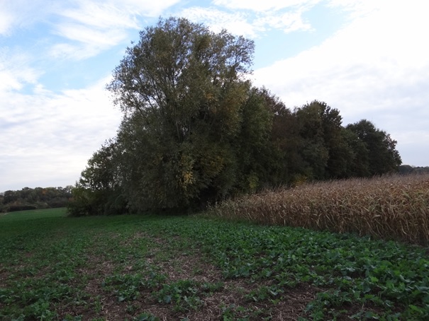 Le petit boisement isolé à gauche, la ripisylve du ru de Vaudessart à droite et Sancy au fond en haut (photo du 27 octobre 2015)