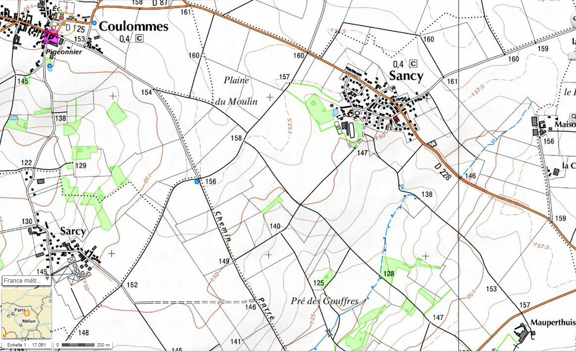 ![]() Le petit boisement isolé, vu depuis le haut, au coin du bois un grand saule, respectable, qui pourrait être proposé pour figurer dans les arbres remarquables de Seine-et-Marne. On n’avait pas emmené de mètre pour mesurer son tour de taille, il faudra revenir. La parcelle au dessus du champ de maïs est humide, un filet d’eau s’écoule en bordure du bois. Au coin du bois, en bas, le filet d’eau, rejoint par un autre venant du chemin, rentre sous terre. Serait-ce un des gouffres qui on permit de nommer les lieux ? Il nous a paru bien petit pour mériter le nom de gouffre ! M. CORDONNIER, instituteur en 1888, disait pourtant : « dans le Pré des Gouffres les étangs ont été mis en prairies naturelles, très marécageuses en hiver ; dans le Pré des Gouffres on remarque en divers endroits des trous plus ou moins profonds qui lui ont fait donner ce nom ». Quel brionaute aurait des informations, des souvenirs, des documents ou des photos sur ces sujets ? Philippe ROY association R.E.N.A.R.D.. ![]() ![]() Plan d’intendance (vers 1780) de SANCY |
