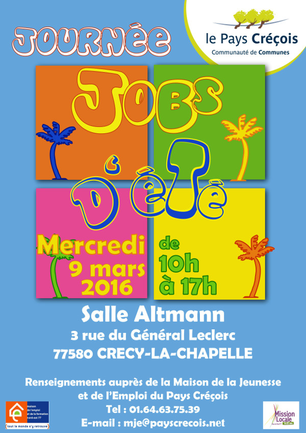 La Maison de la Jeunesse et de l’Emploi du Pays Créçois organise sa journée JOBS D’ÉTÉ le mercredi 9 mars 2016 de 10h à 17h, dans la salle Altmann, 3 rue du Général Leclerc à Crécy-la-Chapelle.