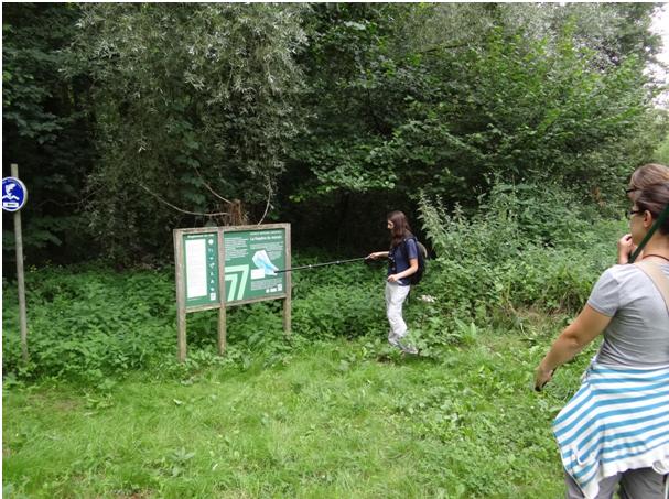 Chloé CHABERT, de Seine-et-Marne Environnement devant le panneau d’entrée de l’ENS La Frayère du Marais : « Un ENS est un espace naturel acquis et géré par le département avec le produit d’une taxe sur les constructions. Cette démarche consiste à protéger des espaces naturels pour le bien être des habitants. » |