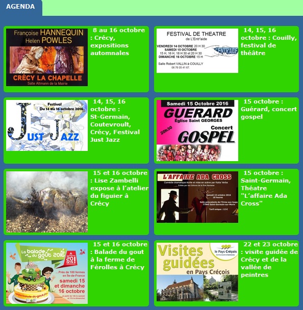 Mais on ne le sait pas toujours. L’association "Entre Marne Et Grand Morin" (l’ex office du tourisme du pays créçois) les répertorie en permanence. La liste n’est pas garantie exhaustive mais elle essaie d’être la plus complète possible, en tous cas sans équivalent à ma connaissance. Alors n’hésitez pas à venir consulter régulièrement le site www.emegm.com Sachant que ce qu’apporte l’association c’est bien plus que cela. Des actions qui ont été présentées lors de l’AG qui s’est tenue il y a quelques jours. |