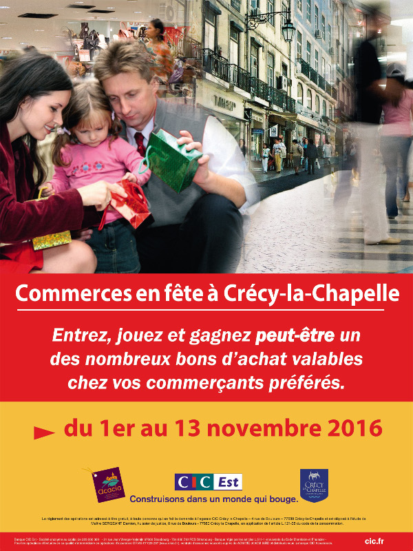A la clé, des bons d’achat à gagner ! Plus de 60 commerçants ont répondu à l’appel du CIC pour animer le centre-bourg de Crécy-la-Chapelle. Vous les reconnaitrez à l’affichette apposée sur la vitrine : «commerces en fête». Une urne sera présente chez chaque commerçant participant. Pour participer, déposez votre bulletin. Un tirage au sort désignera les gagnants des bons d’achat mis en jeu dans chaque magasin. Le tirage au sort sera effectué sous contrôle d’huissier. |