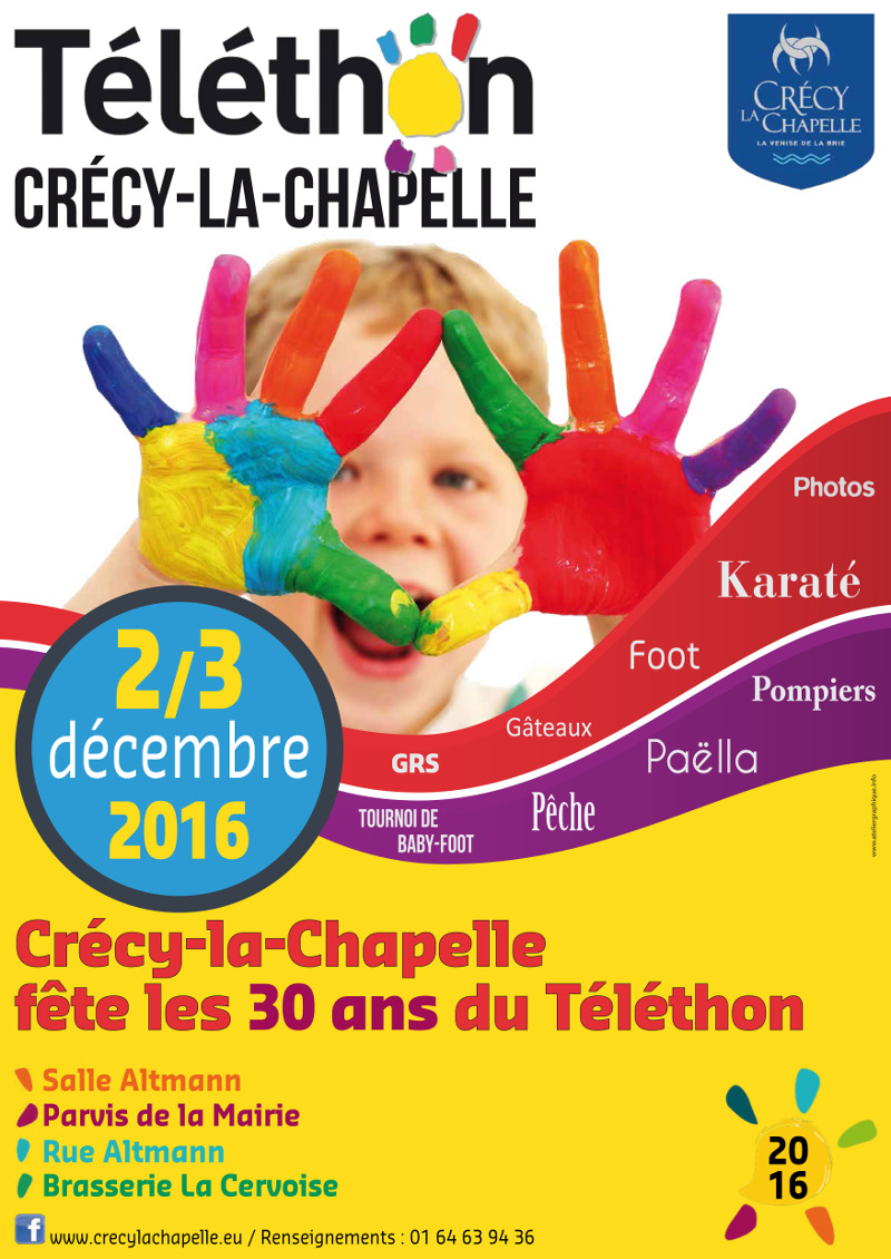 De nombreuses actions solidaires se dérouleront lors du Téléthon 2016 à Crécy-la-Chapelle : – Football : mesurez la vitesse de vos tirs aux buts ! – Gymnastique rythmique et karaté : démonstration le samedi salle Altmann, participation au chapeau. GR : 10h30-15h, karaté 15h-18h. – Enfilez le casque de pompiers le temps d’une photo – Tournoi de baby-foot à la Cervoise : de 20h à 1h du matin vendredi, de 5h à 20h samedi ! – Simulateur de pêche : la pêche au gros comme si vous y étiez ! Vente d’articles Téléthon Restauration et buvette sur place : paella géante, gâteaux, crêpes et boissons seront proposées par les associations durant toute la durée du Téléthon. Les recettes seront intégralement reversées à l’AFM Téléthon.