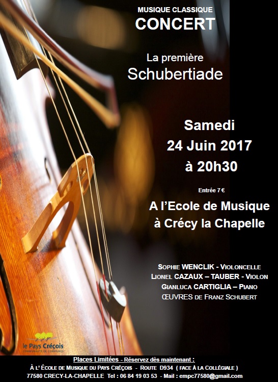 Première "Schubrtiade" interprétée par Mme Sophie Wenclik au violoncelle, M. Lionel Cazaux au violon et M. Gianluca Cartiglia au piano. Les professeurs, de musique des écoles de Pays Créçois rendent hommage au compositeur Frantz Schubert (1797 – 1828). Très beau concert en perspective, réservez dès à présent au : 06.84.19.03.53 (places limitées). |