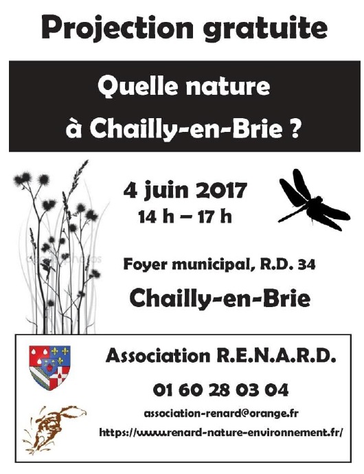 Le R.E.N.A.R.D. vous propose une projection le dimanche 4 juin 2017 à 14 h, au foyer municipal de Chailly-en-Brie prés de Coulommiers. Nous vous y parlerons de biodiversité, de la Brie des étangs, de paysages et de château, à travers notamment le domaine de Voisin qui se trouvent sur la commune. Ce sera également un moment de partage : votre expérience et votre ambition pour le territoire du futur Parc Naturel Régional ! L’entrée est libre et ouverte à tous ! Merci de diffuser l’information autour de vous ! Contacts et informations : 01 60 28 03 04 ou association-renard@orange.fr |