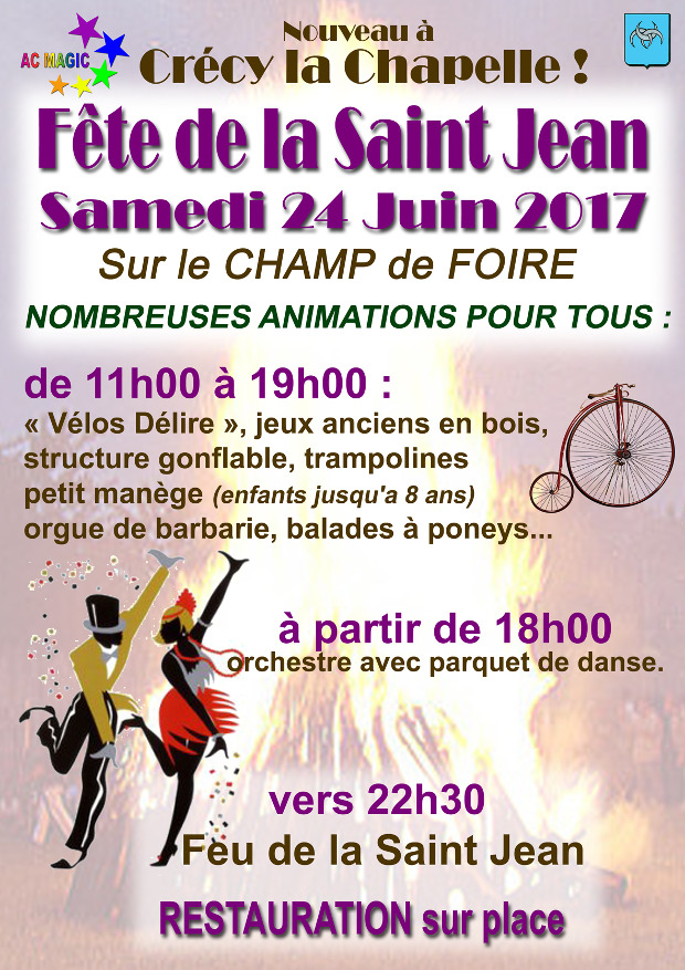 Samedi 24 Juin, l’association AC MAGIC de Crécy-La-Chapelle, organise la "Fête de la Saint-Jean" sur le "Champ de Foire" (centre ville) De 11h00 à 19h00 : nombreuses animations pour tous :"vélos délire",, trampolines, structure gonflable, jeux anciens en bois, orgue de barbarie, petit manège, balades à poney…etc A partir de 18h00 : orchestre de Variétés, Vers 22h30 : feu de la Saint Jean Restauration sur place Renseignements au 06.13.13.29.23 Venez nombreux ! |