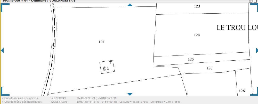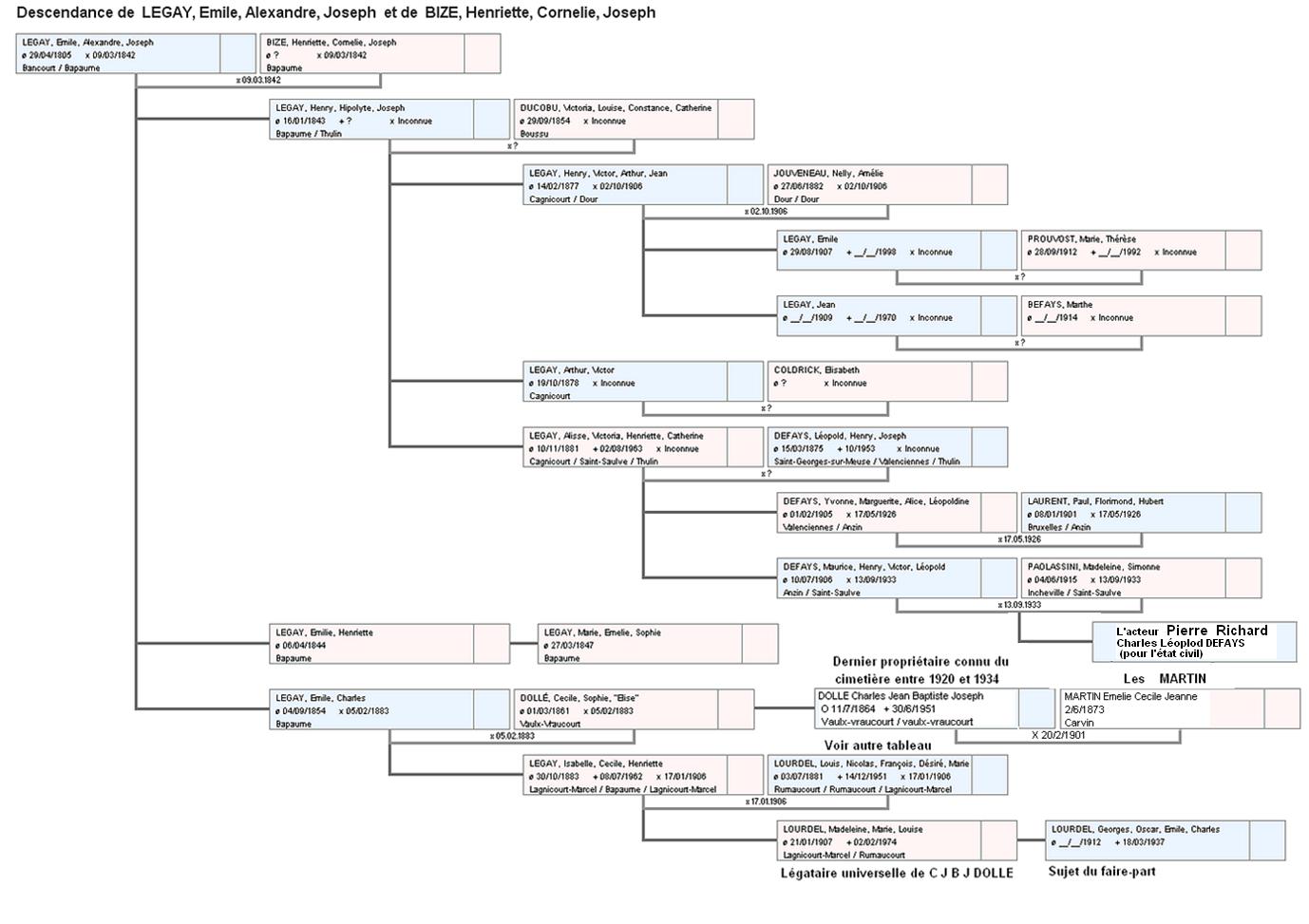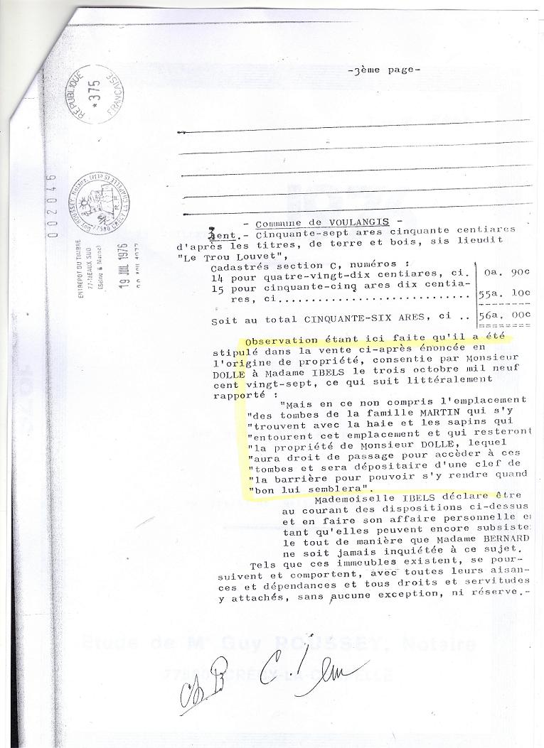 La situation de la parcelle sur le cadastre de Voulangis.  La cousinade de M DOLLE et de sa légataire universelle Mlle LOURDEL. A noter dans les descendants lointains l’acteur Pierre RICHARD.  Le droit de passage indiqué dans l’acte. |