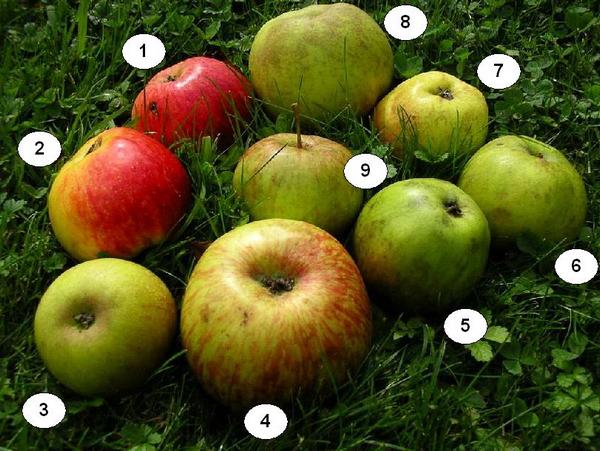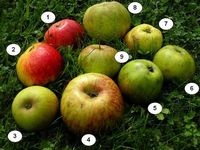 L’association des croqueurs de pomme est très active dans la région, son président national est d’ailleurs un Voulangeois Claude Scribe. Elle organise des ventes de greffons et donne des cours de greffe afin de poursuivre la tradition et sauver les espèces. Malheureusement encore trop de vergers sont à l’abandon, de vieux arbres meurent sans remplaçants, beaucoup auraient besoin d’élagage. Des vergers disparaissent pour laisser place à des constructions, par exemple, cette semaine en plein village de Voulangis. Je critique mais ce n’est guère mieux chez moi : Ah, la cueillette des pommes ! un vrai plaisir d’automne ! Pour vous faire partager ce plaisir, regardez bien la photo : chaque arbre est représenté par une de ses pommes; je vous propose de chercher à les reconnaître.