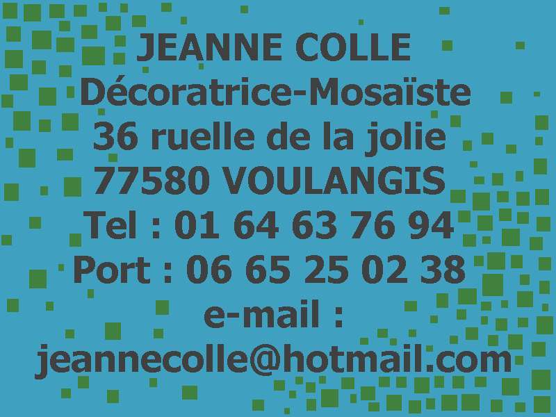 Aujourd’hui, de retour à Voulangis, en Pays Créçois, Jeanne débute son activité professionnelle en tant que décoratrice – mosaïste, sous le statut d’artiste auteur.