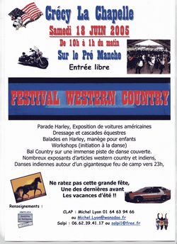 Le 18 juin 2005, pour fêter la Saint-Jean, le CLAP a préparé, un nouveau festival western country de 10 heures à 1 heure du matin, sur le Pré Manche. Harleys, voitures américaines, chevaux, cow bows et indiens, tous les ingrédients de l’ouest sauvage seront réunis dans la prairie créçoise sur les bords du coloradorin. Grand feu de St Jean de lynx, à partir de 23 heures, avec fumées et danses indiennes … le programme détaillé en cliquant ici… |
