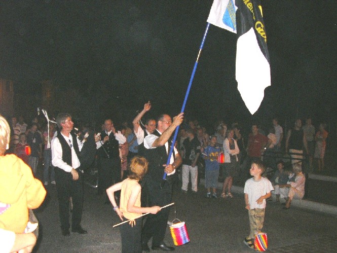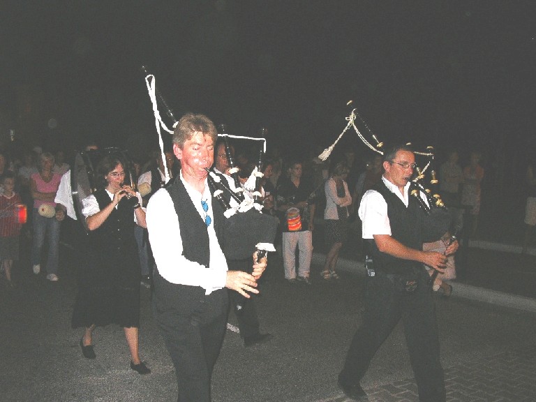 Sous les sons des 3 types d’instruments (bombarde, cornemuse et batterie) rendant hommage aux airs celtes appréciés de tous et éclairés par des lampions tenus par beaucoup d’enfants de tous ages, le cortège arriva au stade pour laisser la place au feu d’artifice. Celui-ci fut grandiose comme les feux d’artifices de Crécy en général. Mélangeant les fusées classiques avec des compositions rouges près du sol, le spectacle avait semble-t-il pour thème "les couleurs de la France", le bleu, le blanc et le rouge étant dominantes. Plusieurs fois on cru que c’était le bouquet final, c’est pour dire si c’était beau !